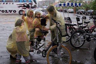 After a good lunch of various things (I'm not sure what all of them were) we traveled to a "famous" bike trail. The picture below is of one of the families (the girl in the back is another fun fourth-grader of mine). As you can see, it was raining so we were all decked out in yellow ponchos! We rented bikes and had a lovely time biking the trails, in spite of the rain.